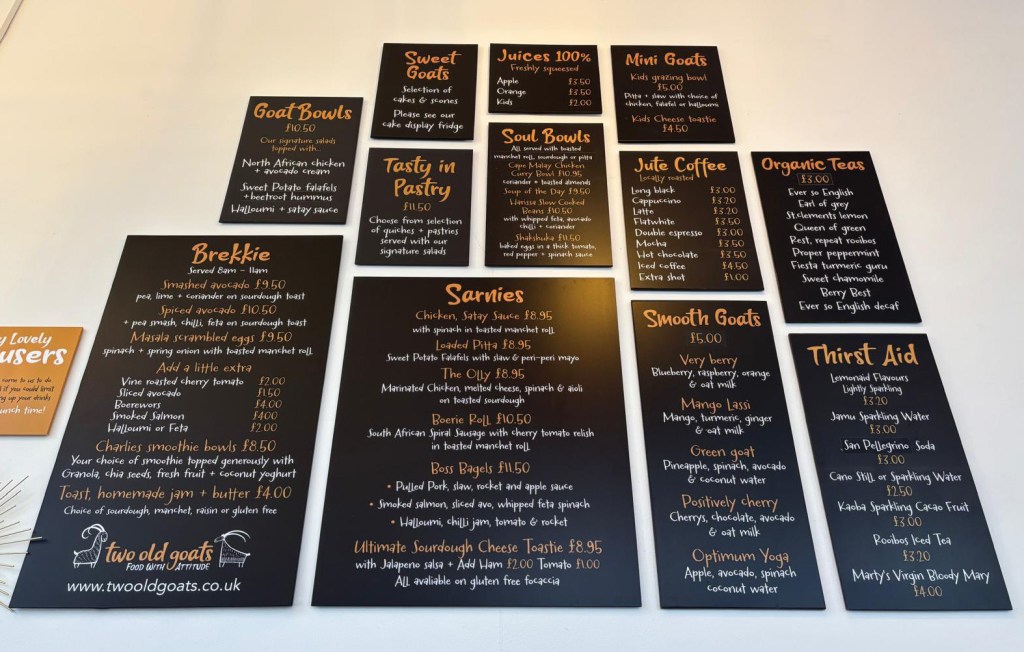 Available to take away or eat in our food is fresh and flavoursome – Two Old Goats Stylee!